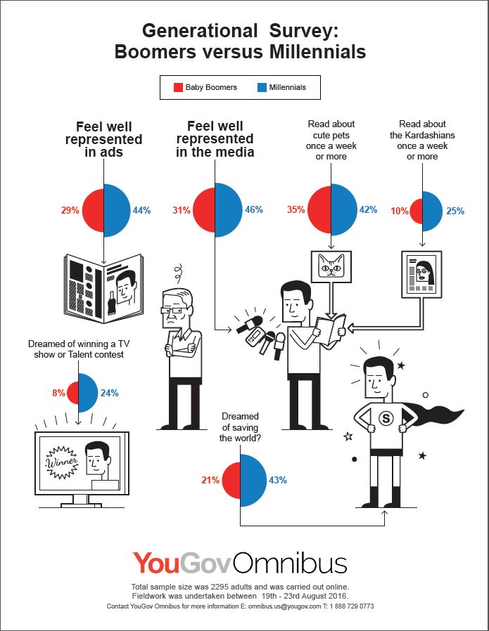 Millennials have already surpassed Boomers as the largest living generation in the US and recognize themselves as the target of much in the media.  Unlike the majority of Boomers only 39% of Millennials feel under-represented in the media, and 40% in advertising. Those who feel under-represented are more likely to attribute this to their socio-economic class (35%) or occupation (30%) than to their age (21%).