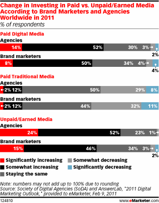 eMarketer’s survey of brand marketers, agencies, technologists and digital industry insiders projects that 24 percent of agencies play to significantly increase unpaid or earned media investments for 2011. Meanwhile, only 15 percent of brand marketers plan to do the same.
